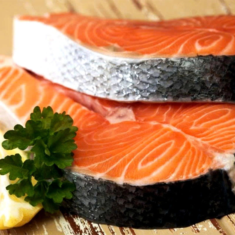 Miếng cá cắt khúc có màu cam hồng đặc trưng, vân mỡ trắng xen kẽ đẹp mắt, cho thấy độ tươi ngon và chất lượng của thịt cá.