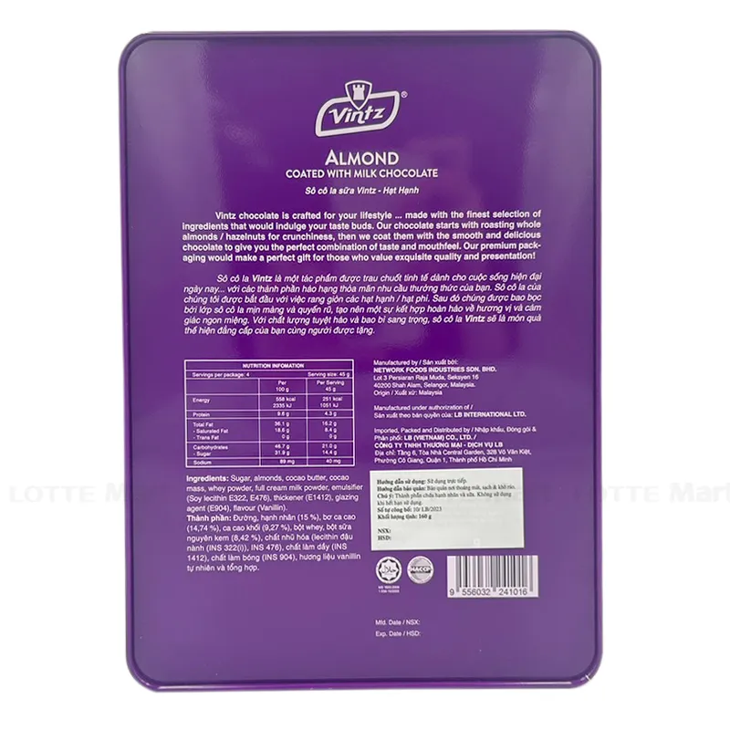 - Socola Vintz Đen Almond Hộp 160G khởi đầu bởi lớp socola đen mịn màng, đậm đà hương vị cacao, ngập tràn bên trong một lớp hành nhân giòn thơm ngon đặc sắc. Kiệt tác này mang đến sự hòa quyện độc đáo về hương vị và cảm giác ngon miệng với chất lượng tuyệt hảo.