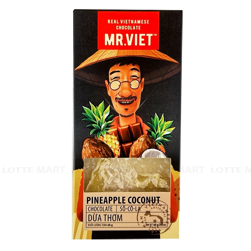- Socola Dừa Thơm MR.VIET Hộp 60G với thành phần chính là socola kết hợp cùng dừa và thơm độc đáo, lạ miệng. Thanh socola ngọt ngào kết hợp cùng lớp dừa tươi thơm bùi, điểm thêm chút chua nhẹ của vài lát thơm tạo nên hương vị đặc biệt, thơm ngon khó cưỡng.