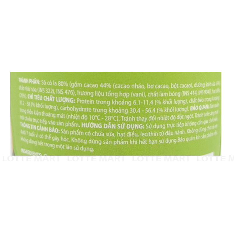 - Socola 80% (ca cao 44% (ca cao nhão, bơ ca cao, bột ca cao), đường, bột sữa, chất nhũ hóa, hương liệu tổng hợp, hạt điều,...