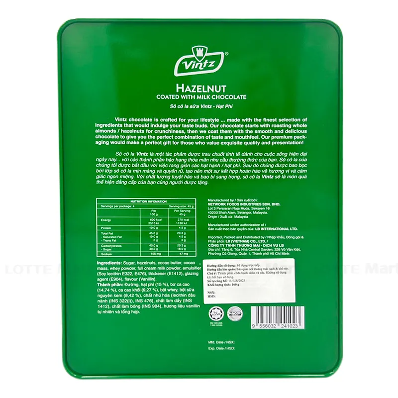 - Socola Sữa Vintz Hạnh Nhân Hạt Dẻ Hộp Thiếc 160G là một tác phẩm được trau chuốt tinh tế dành cho cuộc sống hiện đại ngày nay... với các thành phần chất lượng thỏa mãn nhu cầu thưởng thức của bạn. Sản phẩm được chế biến từ những khâu đầu tiên là rang giòn các hạt hạnh nhân và hạt dẻ sau đó được bao bọc bởi lớp socola sữa mịn màng và quyến rũ, tạo nên một hương vị và cảm giác ngon miệng.