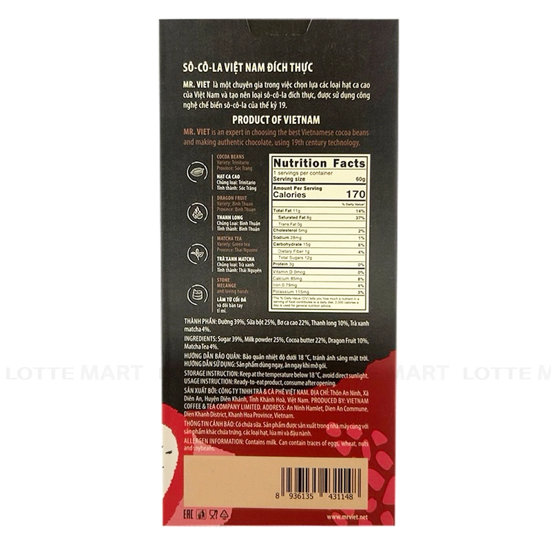 - Socola Trà Xanh Thanh Long MR.VIET Hộp 60G với thành phần chính là socola kết hợp cùng thanh long ruột đỏ và matcha trà xanh. Socola béo ngậy cùng thanh long dịu nhẹ và chút thơm của matcha trà xanh đã tạo nên miếng socola đặc biệt với hương vị mới lạ, khó quên.