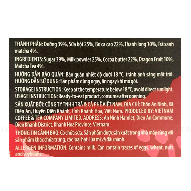- Sữa bột 25%, đường 39%, bơ ca cao 22%, thanh long 10%, trà xanh matcha 4%.