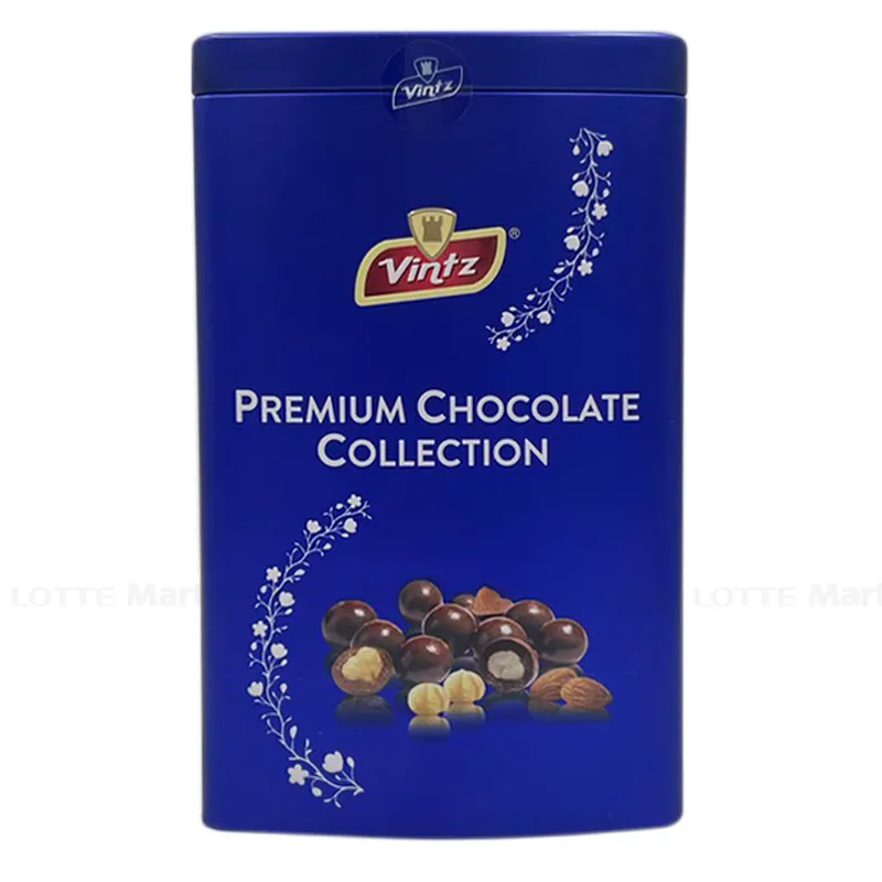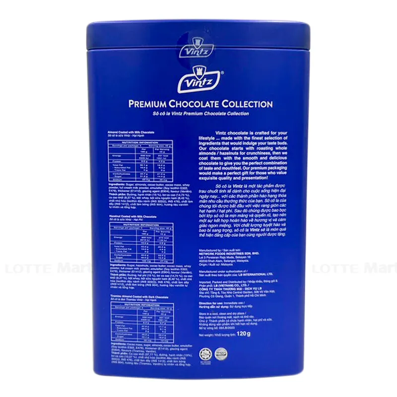 - Socola Vintz Premium Hộp Thiếc 120G chưa ba loại socola gồm Socola Sữa Hạnh Nhân, Socola Sữa Hạt Phỉ, Socola Đen Tiramisu Hạnh Nhân. Các loại socola này đều khởi đầu bởi lớp socola đen mịn màng, đậm đà hương vị cacao, ngập tràn bên trong một lớp nhân thơm ngon đặc sắc. Kiệt tác này mang đến sự hòa quyện độc đáo về hương vị và cảm giác ngon miệng với chất lượng tuyệt hảo.