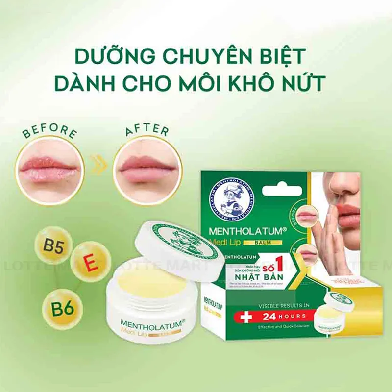 Son Dưỡng Môi Mentholatum Medi Lip Balm Hũ 7G là dòng son dưỡng môi đến từ thương hiệu mỹ phẩm Rohto của Nhật Bản, cải thiện khô nứt, dưỡng môi ẩm mịn nhanh chóng, bảo vệ và hỗ trợ phục hồi môi khô khỏi tác động của thời tiết lạnh, khô hanh, thường xuyên tô son và môi khô cơ địa.