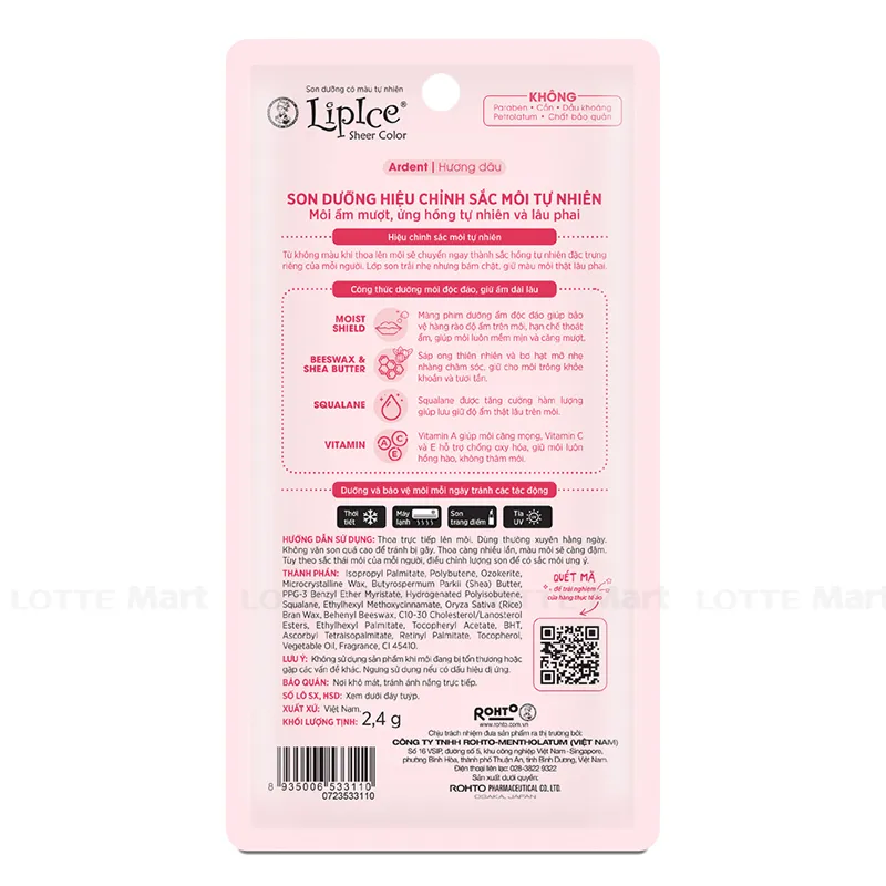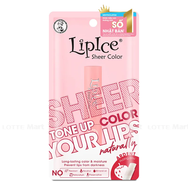• Son dưỡng có màu LipIce Sheer Color Ardent - Hương Dâu khởi điểm từ không màu hoặc màu cam, khi thoa lên môi kết hợp với sắc thái riêng của mỗi người tạo nên màu hồng hoặc hồng pha chút cam tự nhiên đặc trưng.