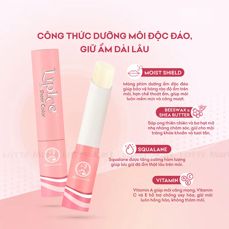 - Moist Shield - Màng phim: dưỡng ẩm độc đáo giúp bảo vệ hàng rào độ ẩm trên môi, hạn chế thoát ẩm, giúp môi luôn mềm mịn và căng mượt.