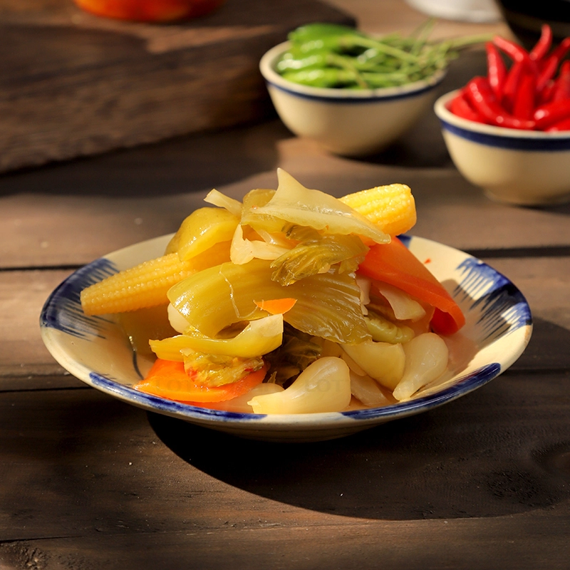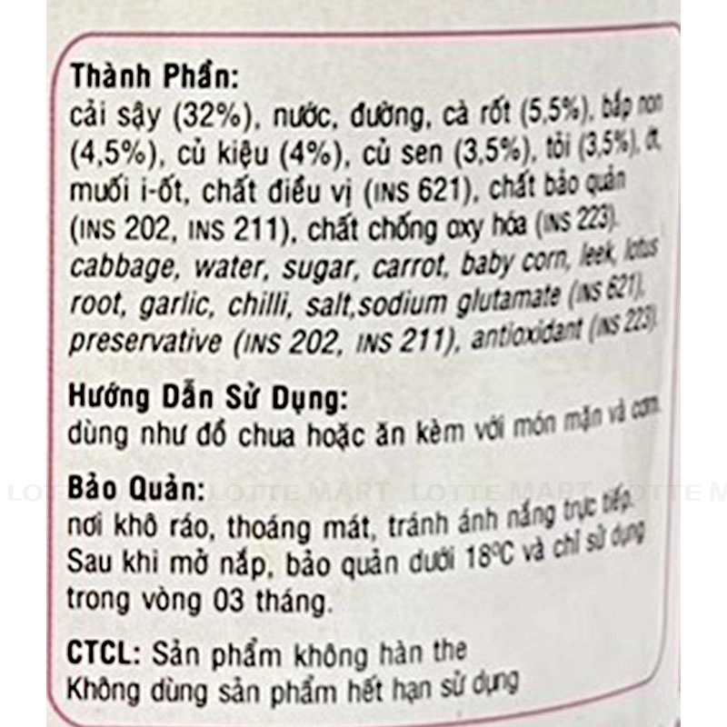 - Thành phần:Cải thìa, nước, đường, cà rốt, cùi non, củ mài, củ sen, tỏi, muối i-ốt,..