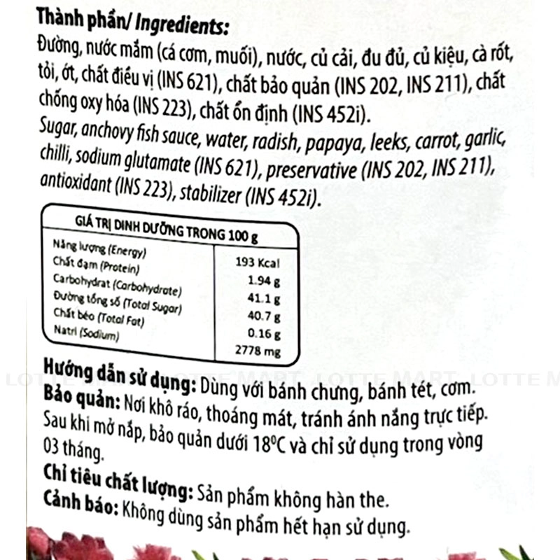 - Thành phần: Củ cải (11%), đu đủ (11%), củ mài (6%), cà rốt (3%), tỏi, ớt, nước, đường, mắm,