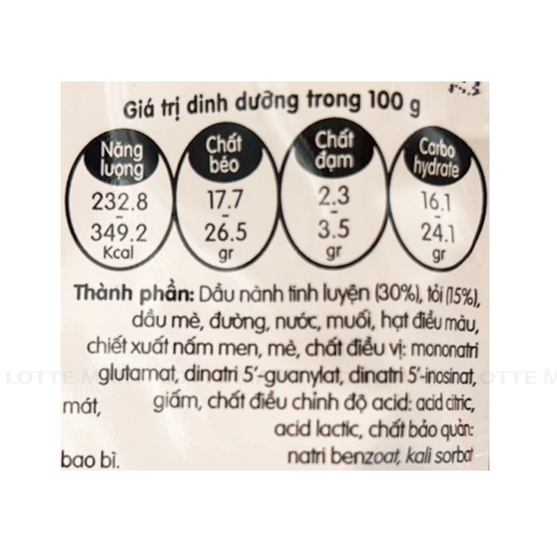 - Dầu nành tinh luyện (30%), tỏi (15%), dầu mè, đường, nước, muối, hạt điều màu, chiết xuất nấm men, chất điều vị, giấm, chất điều chỉnh độ acid, chất bảo quản.
