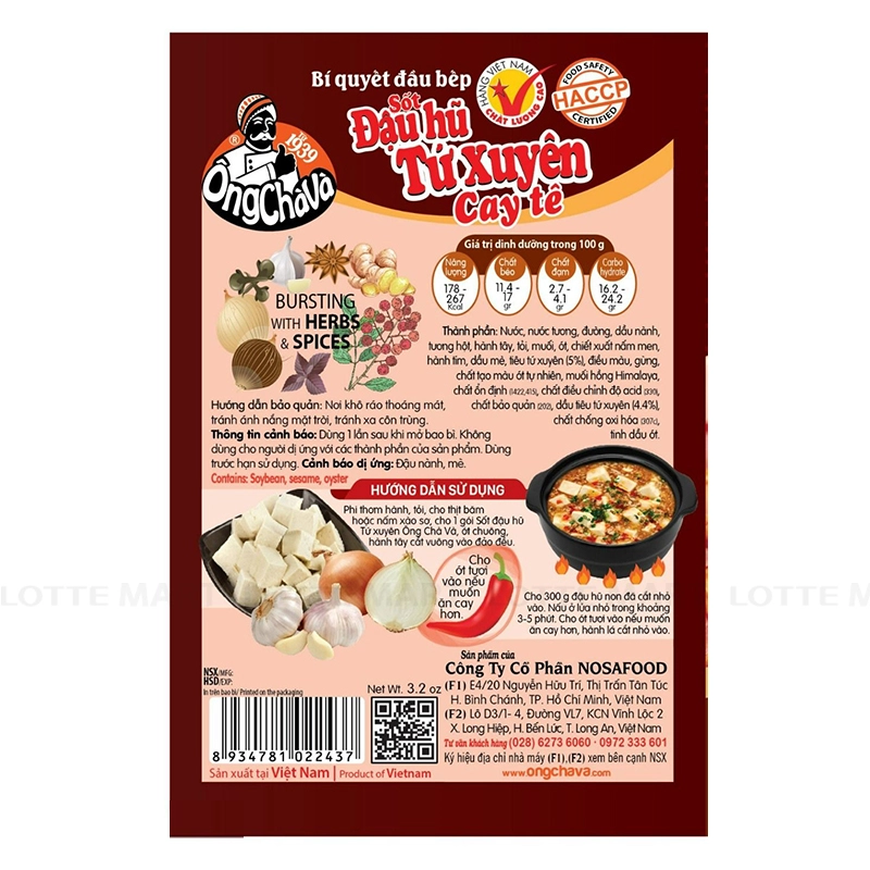 - Sốt đậu hũ Tứ Xuyên Ông Chà Và đạt tiêu chuẩn ISO 22000 và HACCP, chứng minh cho quy trình sản xuất đạt yêu cầu về an toàn vệ sinh thực phẩm. Được thiết kế gọn nhẹ, sản phẩm cực kỳ tiện lợi để mang theo và sử dụng.