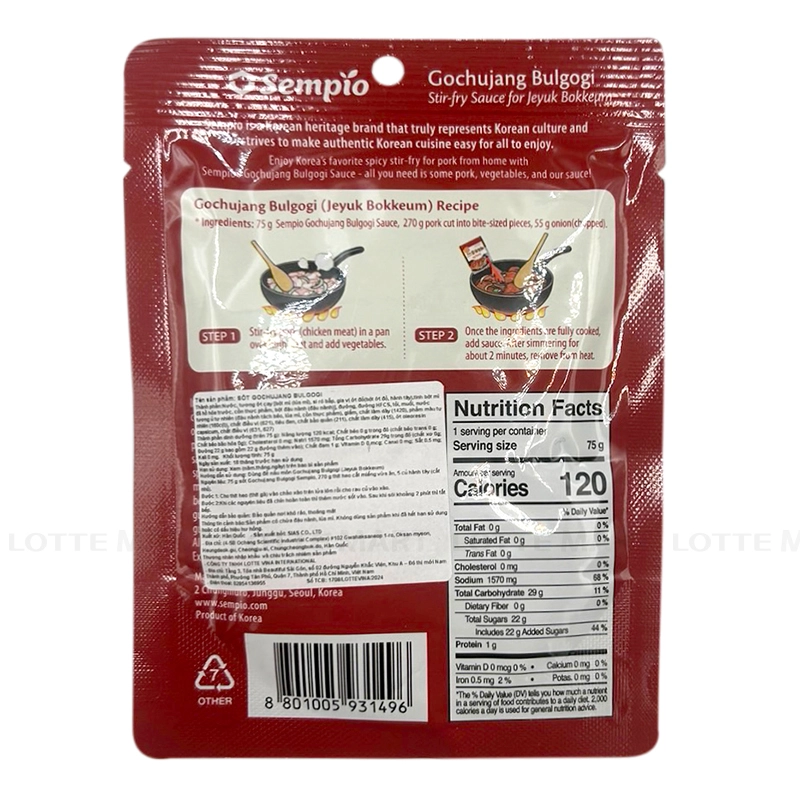 - Sốt Gochujang Bulgogi Sempio là sự lựa chọn hoàn hảo để mang hương vị phong phú của món bulgogi Hàn Quốc vào bữa ăn gia đình bạn. Được đóng gói tiện lợi, loại sốt này giúp bạn dễ dàng chế biến món ăn thơm ngon chỉ trong vài bước đơn giản. Chỉ cần rưới sốt lên thịt bò hoặc thịt lợn thái mỏng, bạn sẽ có ngay một món bulgogi đậm đà và hấp dẫn.