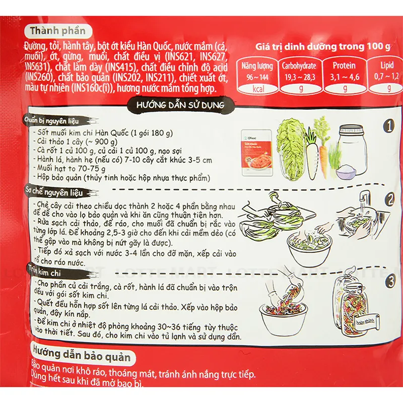 - Sốt Muối Kim Chi O'food Cay Dịu Gói 180G là loại sốt muối kimchi được làm bằng công thức pha trộn giữa nhiều nguyên liệu thông qua chọn lọc kĩ như bột ớt, hành tây, tỏi, nước mắm cá, ớt, gừng,..mang đến đủ mùi vị chua, cay, mặn, nồng cần có cho món kimchi. Với sản phẩm này, bạn chỉ cần trộn đều sốt lên rau củ sau khi sơ chế sạch rồi để bên ngoài nhiệt độ phòng khoảng gần 2 ngày rồi cho vào tủ lạnh là có thể làm món banchan ăn kèm mỗi ngày.