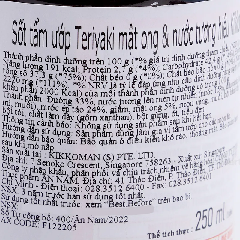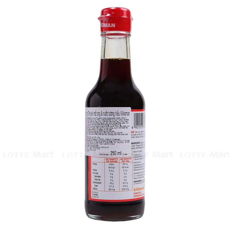 Sốt Tẩm Ướp Teriyaki Mật Ong Và Nước Tương Kikkoman (250ml) với thành phần hương tự nhiên, không phẩm màu thực phẩm, đảm bảo an toàn cho sức khỏe. Sản phẩm được sản xuất trên dây chuyền công nghệ hiện đại, đảm bảo chất lượng và an toàn cho người sử dụng. Nước tương có vị đậm đà, mật ong ngọt thanh và độ sánh đặc trưng, giúp kích thích vị giác, tăng cảm giác ngon miệng khi ăn. Dùng để tẩm ướp các món kho, chiên, nướng với thành phần hương tự nhiên đảm bảo an toàn cho sức khỏe. Sản phẩm được đóng chai tiện dụng, thông tin sản phẩm rõ ràng, dễ dàng bảo quản.