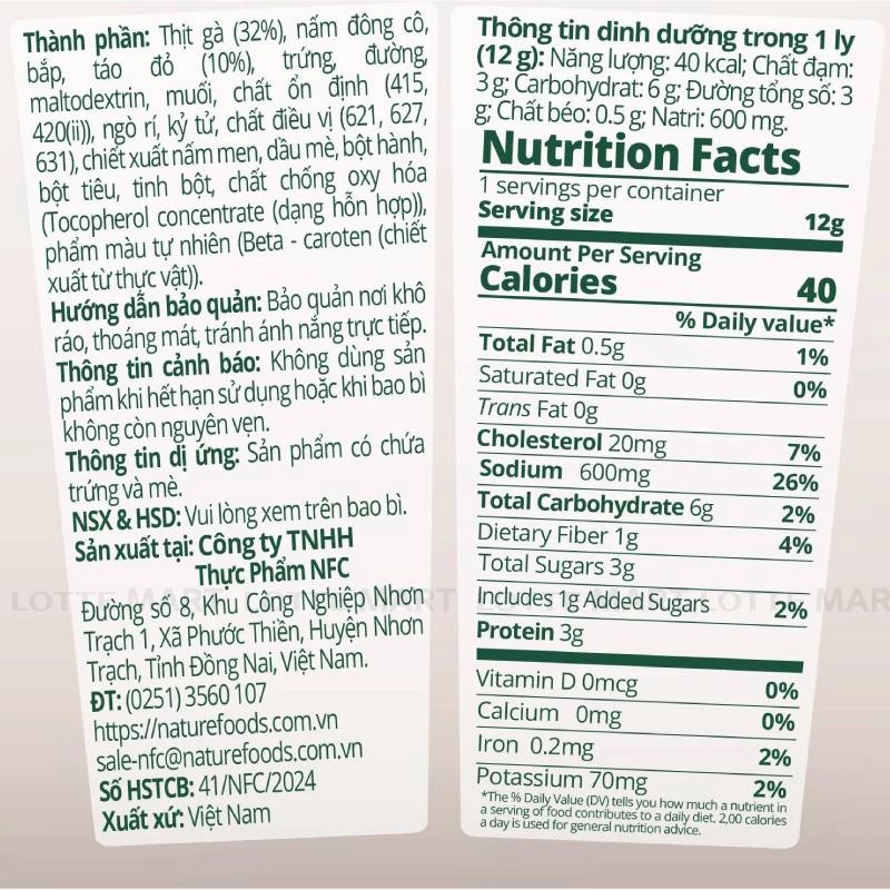 - Thịt gà (32%), nấm đông cô, bắp, táo đỏ (10%), chất ổn định (415, 420(ii)), ngò rí, kỷ tử, dầu mè, chất điều vị (621, 627, 631), chiết xuất nấm men, bột hành, bột tiêu, tinh bột, chất chống oxy hóa (Tocophereol concentrate (dạng hỗn hợp)), phẩm màu tự nhiên (Beta -caroten (chiết xuất từ thực vật)).