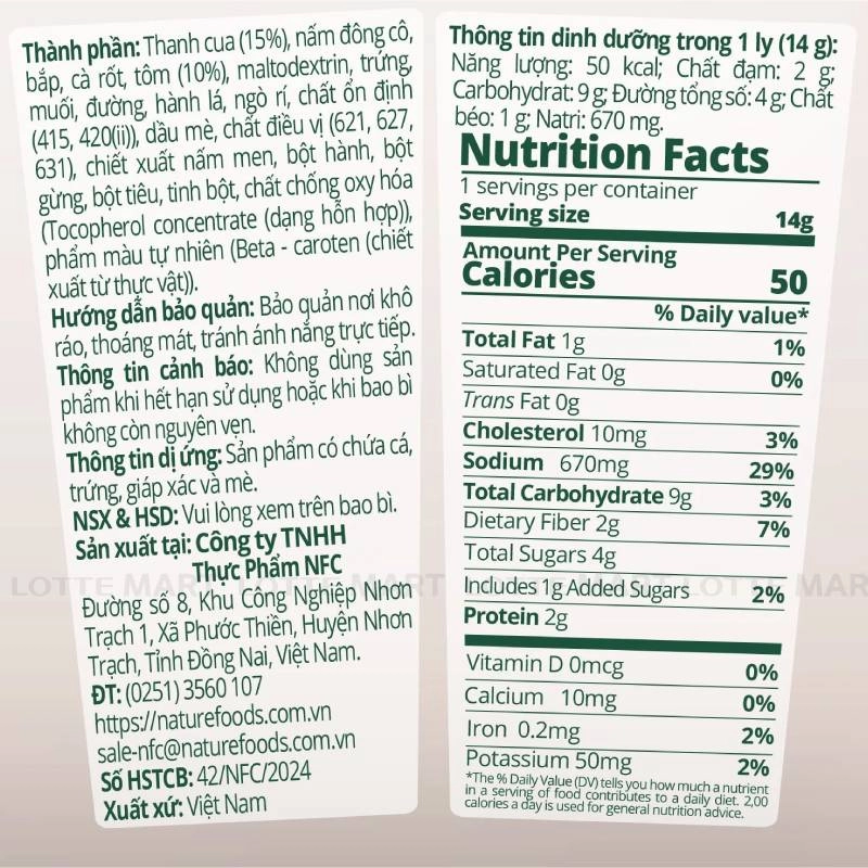 - Thanh cua (15%), nấm đông cô, bắp, cà rốt, tôm (10%), maltodextrin, trứng, muối, hành lá, ngò rí, chất ổn định (415, 420(ii)), dầu mè, chất điều vị (621, 627, 631), chiết xuất nấm men, bột hành, bột gừng, bột tiêu, tinh bột, chất chống oxy hóa (Tocophereol concentrate (dạng hỗn hợp)), phẩm màu tự nhiên (Beta -caroten (chiết xuất từ thực vật)).