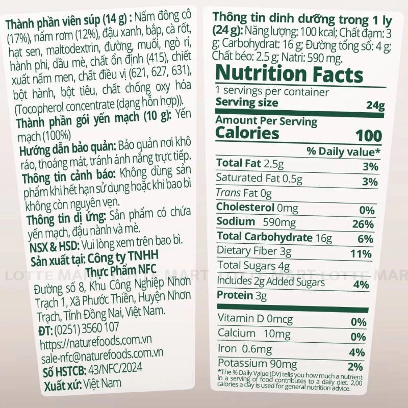 - Gói súp: Nấm đông cô (17%), nấm rơm (12%), đậu xanh, bắp, cà rốt, hạt sen, maltodextrin, đường, muối, ngò rí, hành phi, dầu mè, chất ổn định (415), chiết xuất nấm men, chất điều vị (621, 627, 631), bột hành, bột tiêu, chất chống oxy hóa (Tocopherol concentrate (dạng hỗn hợp)).