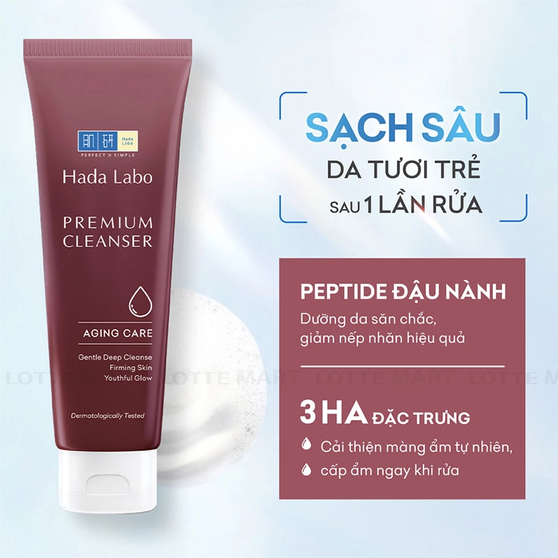 Sữa Rửa Mặt Hada Labo Premium Cleanser Aging Care Hỗ Trợ Ngăn Ngừa Lão Hóa là sản phẩm sữa rửa mặt tạo bọt mịn, làm sạch nhẹ nhàng bụi bẩn và bã nhờn sâu trong lỗ chân lông.