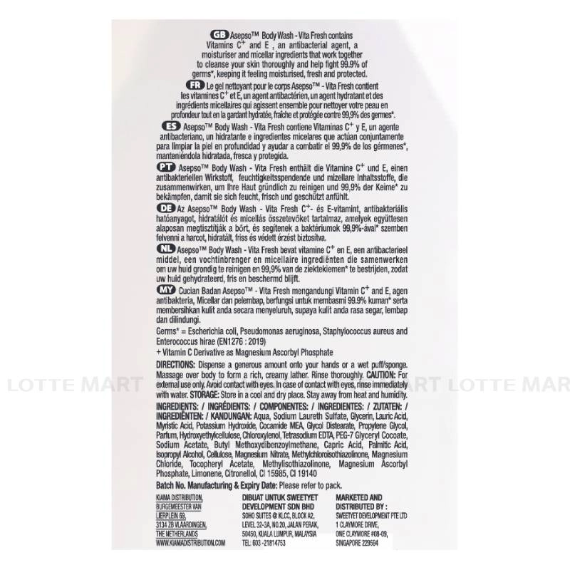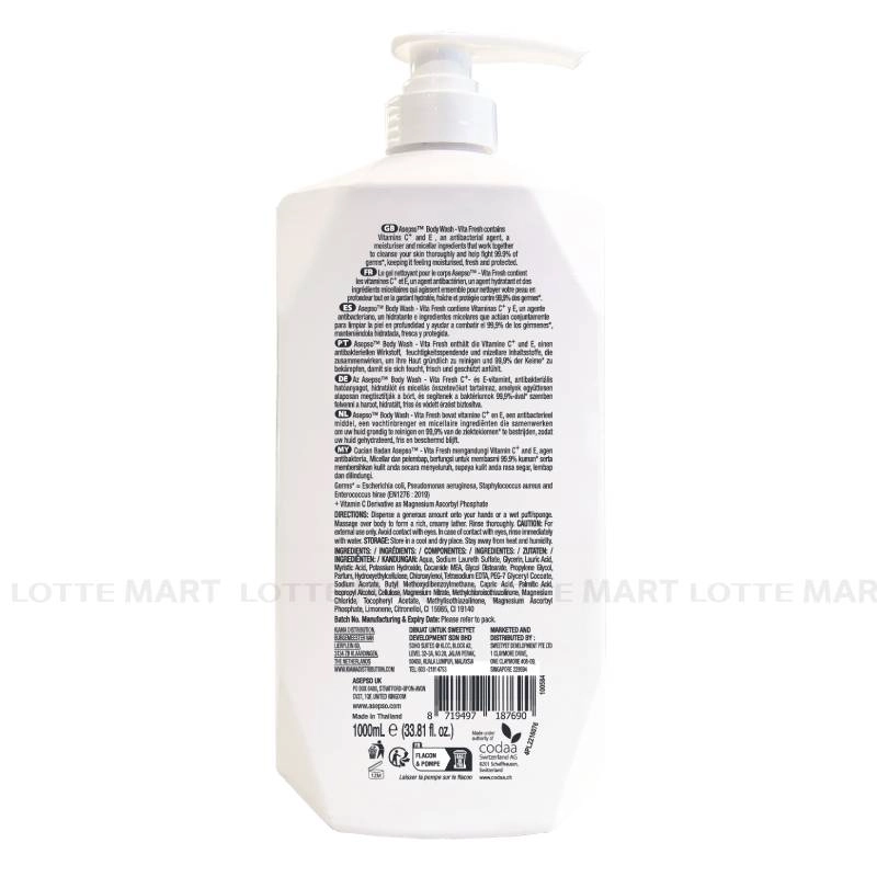 - Sữa Tắm Asepso Kháng Khuẩn Dưỡng Sáng Bổ Sung Vitamin C & E giúp làm sạch nhờ công nghệ Micellar, ngăn bụi bẩn và vi khuẩn đến 99,9%.