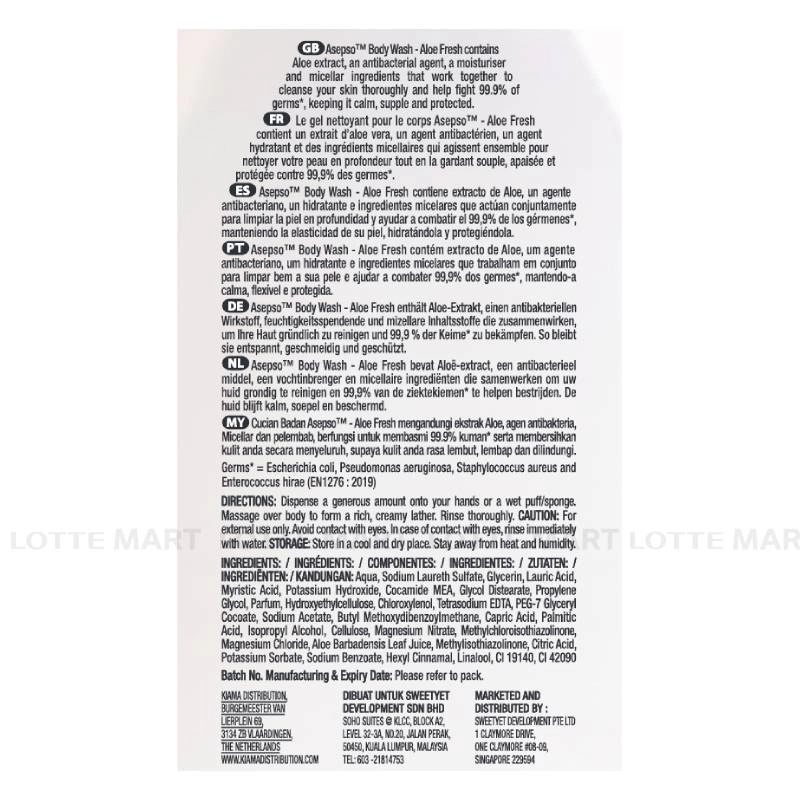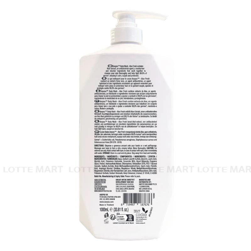 - Sữa Tắm Asepso Kháng Khuẩn Sạch Sâu Cấp Ẩm Nha Đam giúp làm sạch sâu, ngăn ngừa đến 99,9% vi khuẩn.