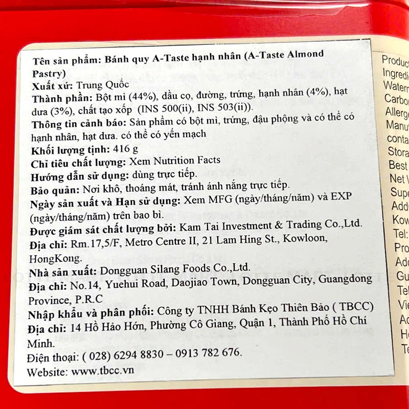 - Bánh Pastry A-Taste Hạnh Nhân là sự kết hợp của trứng gà, bột mì, hạnh nhân và các nguyên liệu tự nhiên khác, mang đến hương vị béo bùi, thơm giòn hấp dẫn.