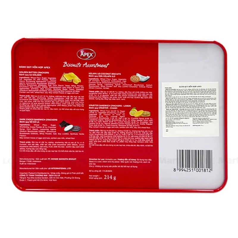 - Ngoài ra, Bánh Quy Apex Hỗn Hợp Hộp Chữ Nhật Rồng Đỏ với thiết kế hộp thiếc sang trọng sẽ là món quà tuyệt vời trong dịp lễ tết cho gia đình, bạn bè và người thân.