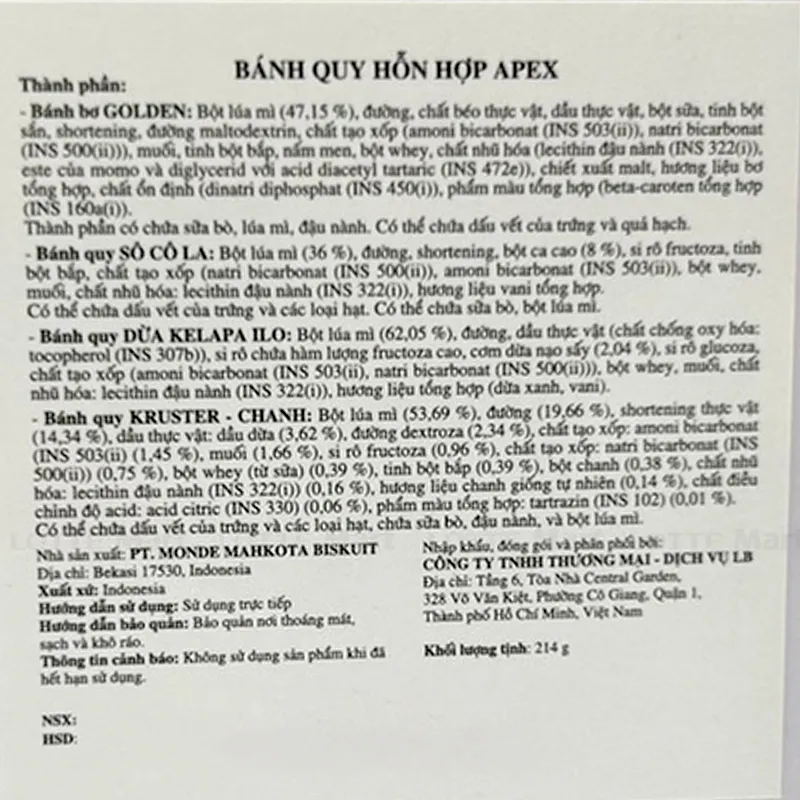 - Bánh Quy Apex Hỗn Hợp là sự chọn lựa tuyệt vời cho những buổi dã ngoại, tiệc trà, món ăn nhẹ đầy thơm ngon dinh dưỡng. Sản phẩm được sản xuất theo công nghệ hiện đại, không sử dụng chất bảo quản độc hại, đảm bảo an toàn cho sức khỏe người tiêu dùng.