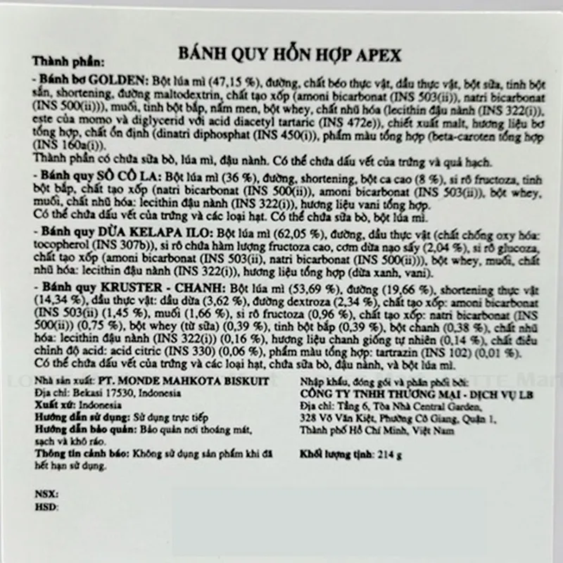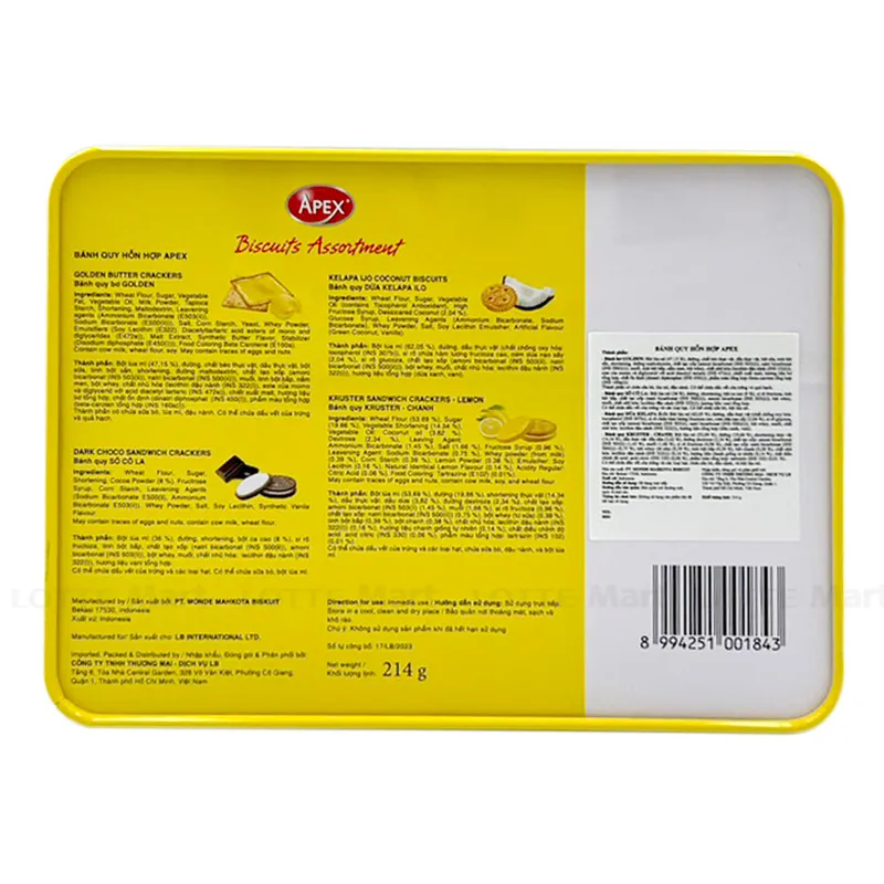 - Bánh Quy Apex Hỗn Hợp Hộp Chữ Nhật Rồng Vàng 214G bên trong có 4 loại bánh đó là bánh bơ golden, bánh quy socola, bánh quy dừa kelapa ilo, bánh quy kruster - chanh. Các loại bánh đều giòn tan tạo nên sự hấp dẫn không thể cưỡng lại. Bánh được đóng hộp lịch sự, sang trọng giúp lưu giữ trọn vẹn độ giòn thơm của sản phẩm.