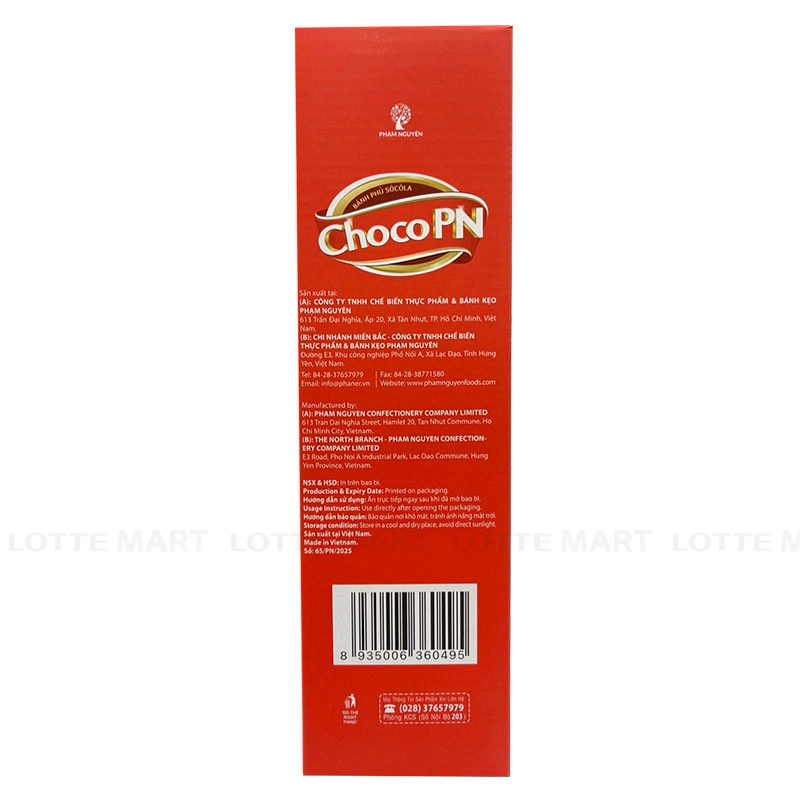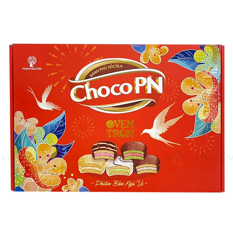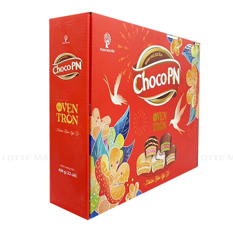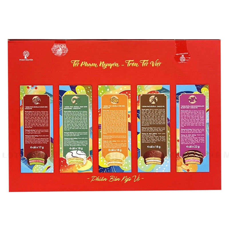 Hộp Quà Tết Bánh ChocoPN Ngũ Vị 301G được kết hợp từ 5 loại bánh choco hương vị mới lạ, độc đáo, cho cả gia đình thưởng thức thật ngon và cung cấp thêm năng lượng, bảo đảm sức khỏe trong những ngày Tết. Hộp quà được đóng gói kín đáo, sang trọng vừa giúp lưu giữ trọn vẹn hương vị của sản phẩm vừa dùng để trang trí rất đẹp mắt. Thiết kế nổi bật với những hình ảnh đặc trưng không khí ngày Tết, đặc biệt là hình ảnh long phượng mang thông điệp tết an yên. Tất cả được kết hợp một cách tinh tế, hài hoà tạo cảm giác ấm áp nhưng vẫn rất sang trọng. Chi tiết hộp quà gồm: Bánh phủ socola vị dưa hấu 3 cái x 17g, bánh phủ socola kem Kaya singapore 3 cái x 18g, bánh phủ socola chip kem marshmallow 3 cái x 18g, bánh phủ socola 3 cái x 18g, bánh socola kem marshmallow và mứt dâu 4 cái x 18g. Hướng dẫn sử dụng: Dùng trực tiếp sau khi mở bao bì. Hướng dẫn bảo quản: Bảo quản nơi khô ráo thoáng mát, tránh ánh nắng trực tiếp. Hạn sử dụng: 12 tháng kể từ ngày sản xuất. Xuất xứ: Việt Nam. Thông tin dị ứng: thành phần có chứa bột mì, trứng, sữa, protein đậu nành, lecithin (có nguồn gốc từ đậu nành).