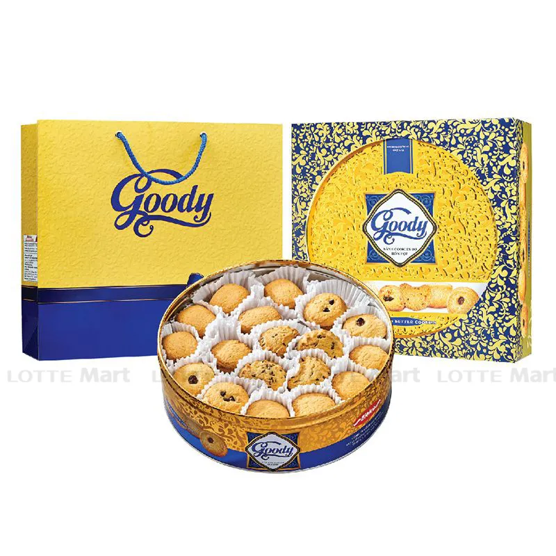 Bánh Goody là một món quà Tết sang trọng, ý nghĩa mang đến sự ngọt ngào, ấm áp dành tặng người thân, bạn bè tiếp đãi khách ngày đầu xuân thay lời cầu chúc một năm mới hạnh phúc đủ đầy. Thành phần: Bột mì, đường, bơ, chất béo thực vật (dầu), trứng (gà), đạm đậu nành, sữa bột, muối, chất tạo xốp (E500(ii), E503(ii)), 2% dừa sấy, 0,3% bột trà xanh, 0,3% nho khô, 0,3% sô cô la hạt, 0,3% hạt điều, hương ( dừa, sữa, vani) tổng hợp, màu tự nhiên (E141(ii)), màu thực phẩm tổng hợp (E160a(i)).