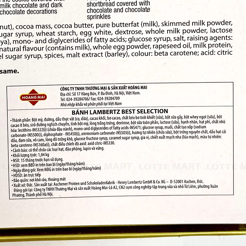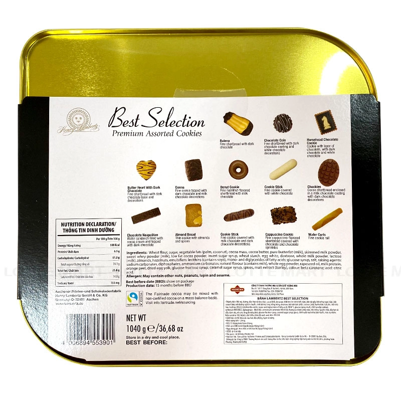 Thương hiệu bánh quy cao cấp Lambertz được khởi đầu từ thế kỷ 17, vào năm 1688 với quy mô từ một hiệu bánh nhỏ ở Đức. Kể từ đó, Lambertz luôn hướng tới sản xuất các loại bánh chất lượng cao, kết hợp các giá trị truyền thống hàng thế kỷ với công nghệ tiên tiến. Ngày nay, Tập đoàn Lambertz là một trong số các nhà sản xuất bánh kẹo hàng đầu của Đức. Bánh Lambertz mặt trời đen 1kg có hương vị thơm ngon của bánh Butter Cookies phủ socola và hạnh nhân. Sản phẩm bao gồm 21 loại bánh quy thượng hạng làm nên tên tuổi của tập đoàn Lambertz, được phủ socola trắng, socola sữa hoặc socola đắng (đen) Bánh Lambertz mặt trời đen thực sự là món quà biếu tặng không thể lịch sự và cao cấp hơn. Sản phẩm có hương vị ngon ngọt, phù hợp cho cả trẻ nhỏ và người lớn. Hướng dẫn sử dụng: Dùng trực tiếp ngay sau khi mở hộp. Hướng dẫn bảo quản: Bảo quản nơi khô ráo thoáng mát tránh ánh nắng trực tiếp. Đậy kín sản phẩm sau khi sử dụng. Xuất xứ: Đức.