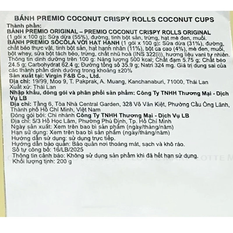 Bánh Premio Original - Premio Coconut Crispy Rolls Original (1 gói x 100G): Sữa dừa, đường, tinh bột sắn, trứng, hạt mè đen, muối.