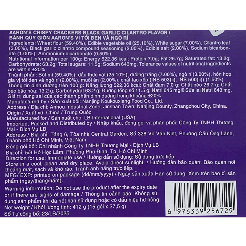 Thành phần: Bột mì, dầu thực vật, đường trắng, ngò rí, hỗn hợp gia vị tỏi đen và ngò rí, muối ăn, chất tạo xốp, INS 500(ii).