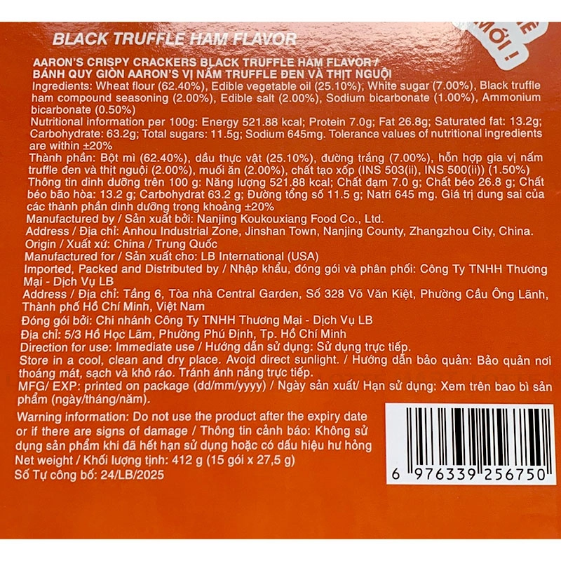 Thành phần: Bột mì, dầu thực vật, đường trắng, hỗn hợp gia vị nấm truffle đen và thịt nguội, muối ăn, chất tạo xốp, INS 500(ii).