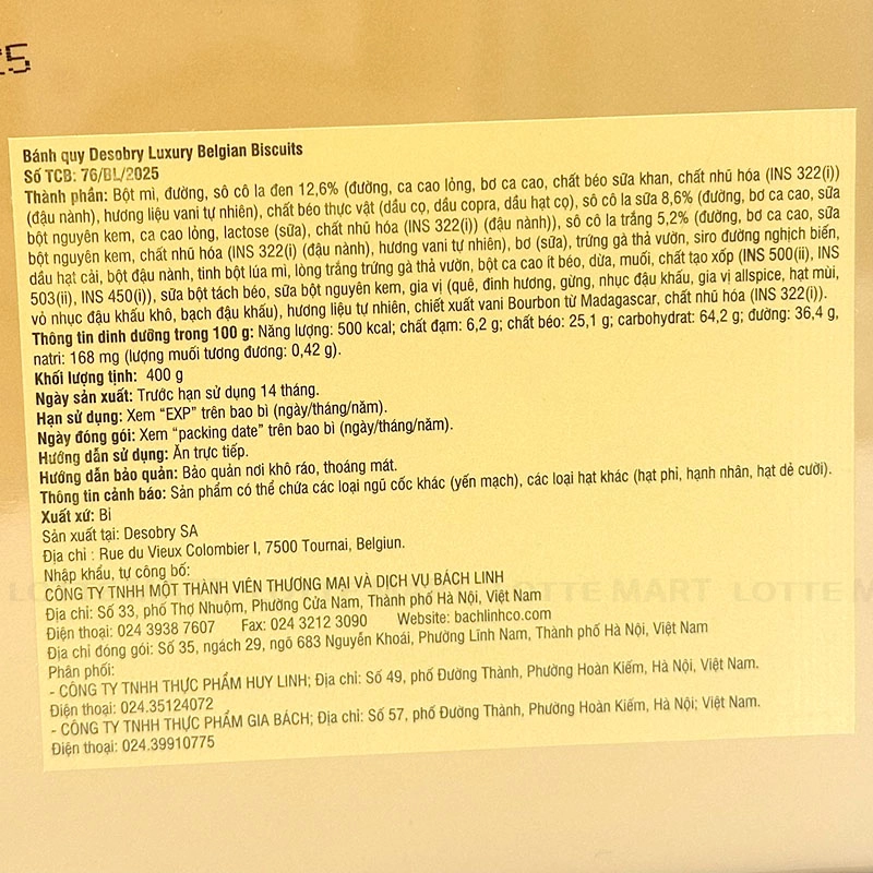 Bánh Desobry Luxury Belgian Biscuitier vàng 400g là loại bánh cao cấp được nhập khẩu từ Bỉ, gồm các loại bánh đặc biệt được phủ sô cô la ngon thơm ngon. Sản phẩm được làm từ những nguyên liệu tự nhiên cao cấp mang đến chất lượng thơm ngon nhất với vị quy bơ thơm giòn, vị sữa béo ngậy hòa cùng vị ngọt ngào của socola … sẽ mang lại cho bạn những giây phút thưởng thức thật tuyệt vời bên cạnh bạn bè hoặc người thân. Desobry là thương hiệu nổi tiếng của Bỉ được thành lập vào năm 1947 và là loại bánh quy được yêu thích rộng rãi ở hơn 40 quốc gia trong hơn nửa thế kỷ qua. Nhiều thập kỷ sau, thương hiệu này đã giữ bí mật về công thức và niềm vui cho khách hàng từ khắp nơi trên thế giới. Được tạo ra với sự xuất sắc trong ẩm thực, bánh quy Desobry là sản phẩm chính thống của Bỉ được làm bằng sô cô la Bỉ thật, mang đến hương vị độc đáo! Được coi là một trong những thương hiệu bánh quy ngon nhất trên thế giới, Deso Bánh Desobry Luxury Belgian Biscuitier vàng 400g với mẫu mã đẹp, sang trọng, cùng chất lượng tuyệt hảo... sẽ là món quà tặng đầy ý nghĩa cho các đối tác, bạn bè và người thân của bạn trong các dịp Lễ, Tết. Hướng dẫn sử dụng: Dùng trực tiếp không qua xử lý nhiệt. Bảo quản: Bảo quản ở điều kiện khô ráo, thoáng mát, tránh ánh sáng trực tiếp, nên giữ kín sau khi mở hộp.