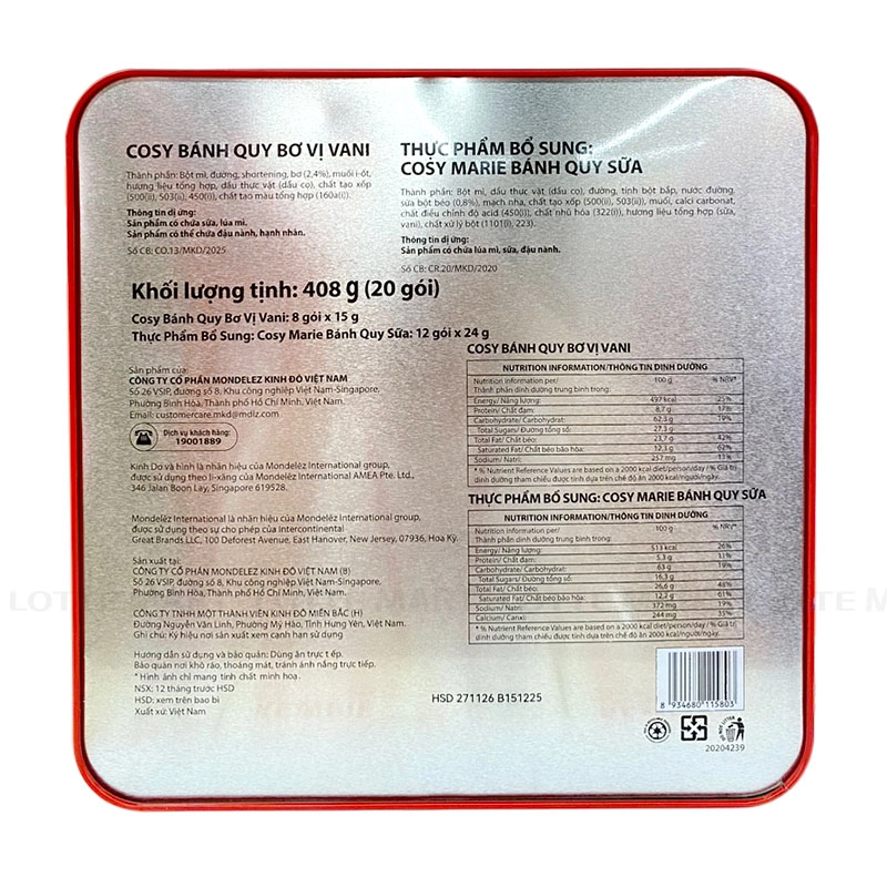 Bánh quy sữa Cosy Marie: Bột mì, dầu thực vật (dầu cọ), đường, tinh bột bắp, nước đường, sữa bột béo (0,8%), mạch nha, chất tạo xốp (500(ii), 503(ii)), muối, calci carbonat, chất điều chỉnh độ acid (450(i)), chất nhũ hóa (322(i)), hương liệu tổng hợp (sữa, vani), chất xử lý bột (1101(1), 223).