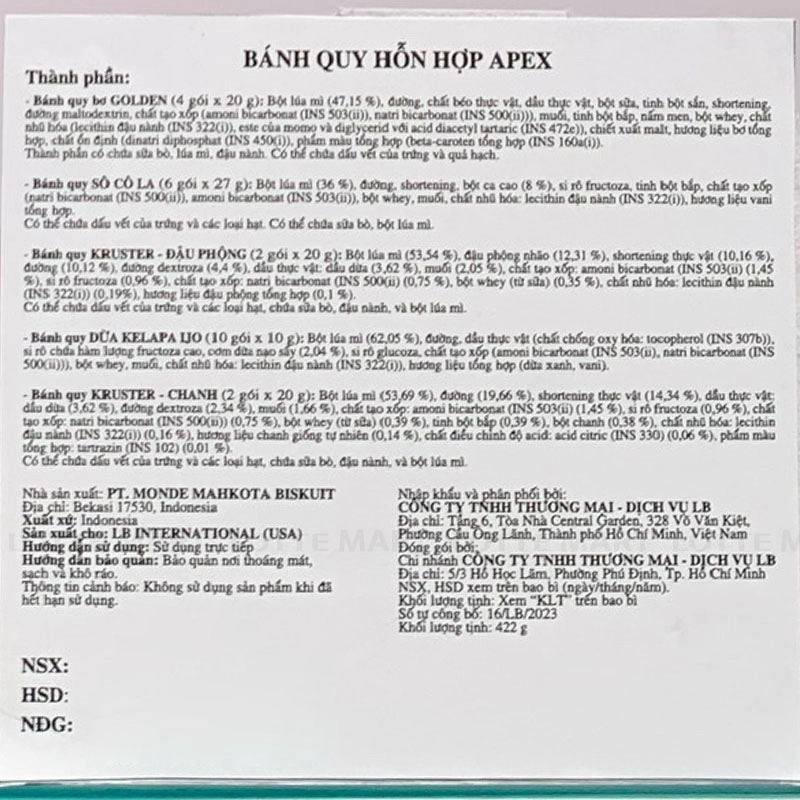 - Bánh quy bơ GOLDEN (4 gói x 20 g): Bột lúa mì, đường, chất béo thực vật, dầu thực vật, bột sữa, tỉnh bột sắn, đường maltodextrin, chất tạo xốp, natri bicarbonat, bột bắp, nấm men, bột whey, chất nhũ hỏn lecin độ nành, củ của momo và diglycerid või acid daceryl tartanic, chiết xuất mát, hương liệu bạn tống hợp, chất ổn định, phẩm màu tổng hợp. Thành phần có chứa sữa bò, lúa mì, đậu nành. Có thể chứa đầu với của trứng và quả hạch.
