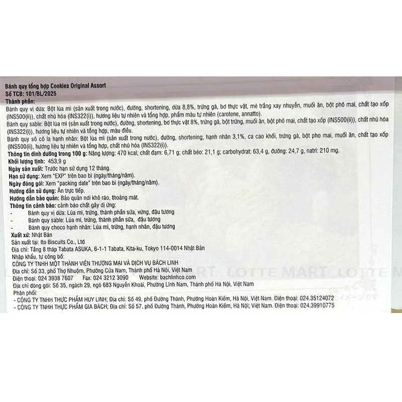 Bánh quy luôn là sự lựa chọn hàng đầu trong các bữa tiệc trà hoặc các bữa ăn nhẹ hàng ngày. Khi có lễ Tết thì bánh quy là món quà dùng để biếu người thân, bạn bè quý mến. Nếu bạn đang muốn tìm cho mình một loại bánh quy thơm ngon trong các bữa tiệc tùng, hội họp sắp tới thì hãy đừng bỏ qua bánh nhập khẩu cao cấp Cookies Original Assort của Nhật Bản. Bánh có hương vị thơm ngon mùi trứng, sữa và lúa mỳ, có độ ngọt vừa phải, phù hợp với khẩu vị của đa số người tiêu dùng. Sản xuất trên dây chuyền hiện đại và tiêu chuẩn khắt khe của Nhật. Cung cấp dinh dưỡng và năng lượng cho người dùng. Đảm bảo an toàn cho sức khỏe. Được áp dụng công nghệ Nhật Bản và các nguyên liệu đều được tuyển chọn kỹ lưỡng nhằm mang đến cho bạn một mùi vị thơm ngon của bột mì kết hợp cùng với bơ sữa và hương vanilla quyến rũ khiến bạn khó có thể dừng lại ở cái bánh đầu tiên. Mỗi hộp bánh đều có 3 hương vị đặc biệt khác nhau giúp cho bạn có thể thay đổi khẩu vị mà không lo bị ngán. Hướng dẫn sử dụng: Dùng trực tiếp. Bảo quản: Nơi khô ráo, thoáng mát, tránh ánh nắng trực tiếp. Hạn sử dụng: 12 tháng kể từ ngày sản xuất.