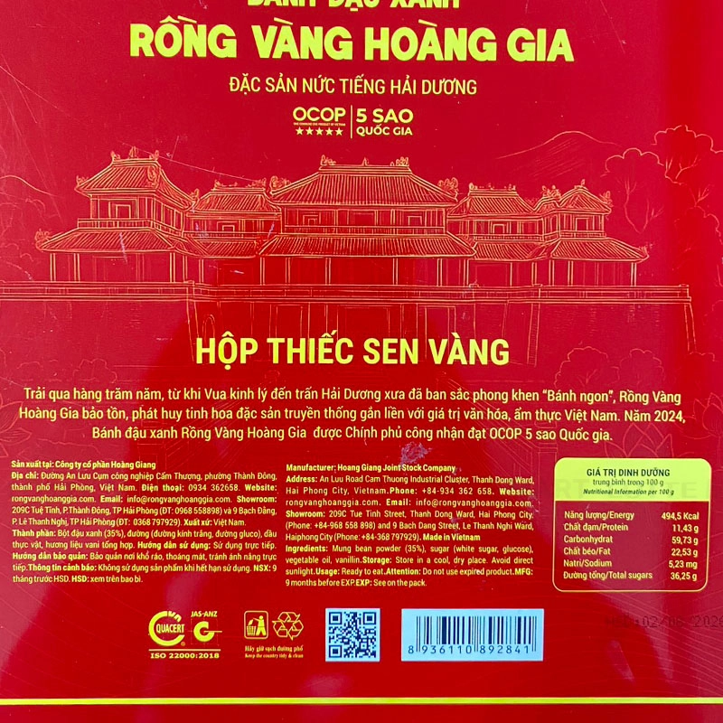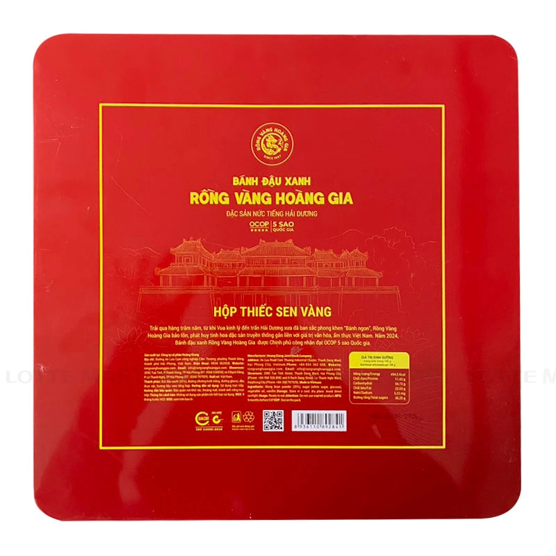 Bánh Đậu Xanh Rồng Vàng Hoàng Gia Sen Vàng với thiết kế hộp thiếc cùng hình ảnh hoa sen vàng rực rỡ trên nền đỏ, mang lại vẻ đẹp thuần khiết, tinh tế và đậm chất truyền thống Việt Nam.