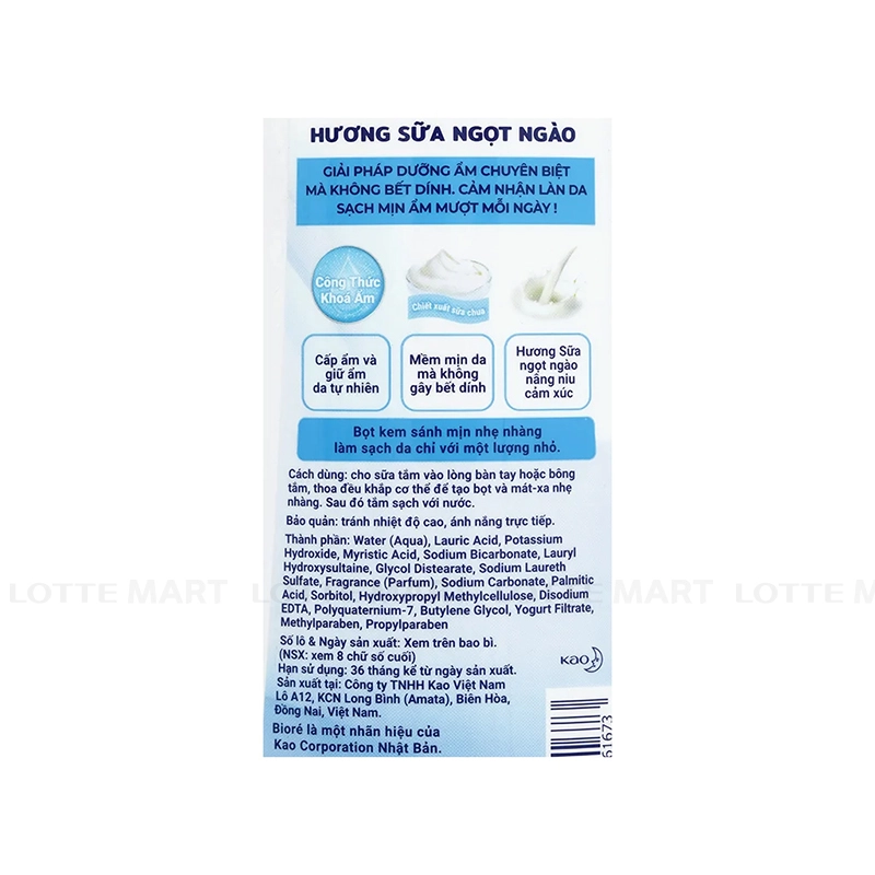- Sữa Tắm Bioré Dưỡng Ẩm Hương Sữa Ngọt Ngào là sản phẩm sữa tắm đến từ thương hiệu Bioré, với tinh chất sữa chua giàu dưỡng chất, Vitamin giúp làn da luôn được tươi trẻ và căng tràn sức sống. Sản phẩm giúp bạn tận hưởng những phút giây thư thái và xua tan mệt mỏi căng thẳng sau một ngày dài làm việc căng thẳng.
