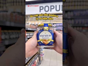 Hộp nhựa trong suốt giúp khoe khéo những hạt hạnh nhân vàng ươm bên trong, kết hợp cùng nhãn xanh dương và viền vàng kim sang trọng, làm nổi bật khay mứt Tết của gia đình.