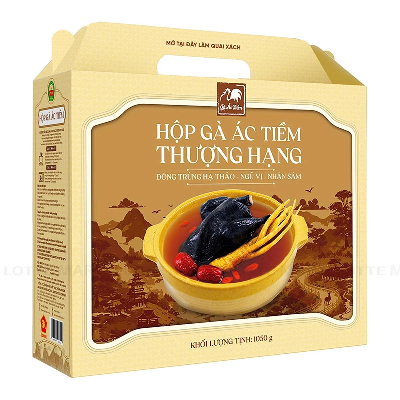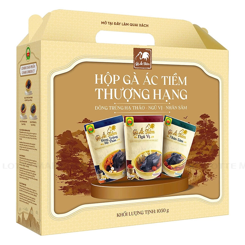 Hộp quà bao gồm 3 gói gà ác tiềm với các vị thuốc từ thiên nhiên là Gà Ác Tiềm Nhân Sâm, Gà Ác Tiềm Ngũ Vị và Gà Ác Tiềm Đông Trùng Hạ Thảo.