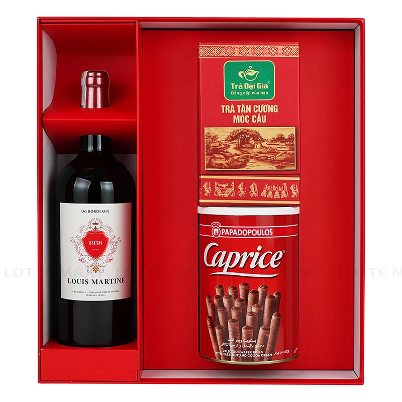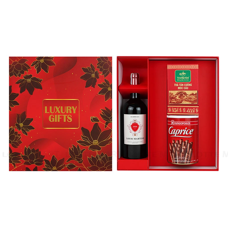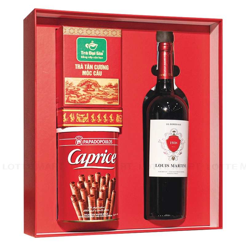 Hộp quà bao gồm 3 sản phẩm chất lượng là Rượu Vang Đỏ Louis Martine Cabernet Sauvignon 13.5% ABV Chai 750ml, Bánh Quế Caprice Kem Hạt Phỉ Cacao Hộp 400G và Trà Tân Cương Móc Câu Trà Đại Gia Hộp 100G.
