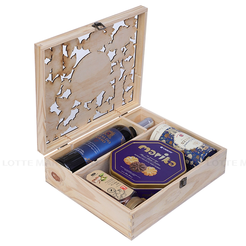 Sự kết hợp hài hòa giữa rượu và trà xanh cùng các món ăn nhẹ như nho khô và bánh quy tạo nên hương vị Tết truyền thống và hiện đại. Hộp quà được đặt trong hộp gỗ chạm khắc hoa văn tinh xảo, thể hiện sự trân trọng và chu đáo của người tặng.