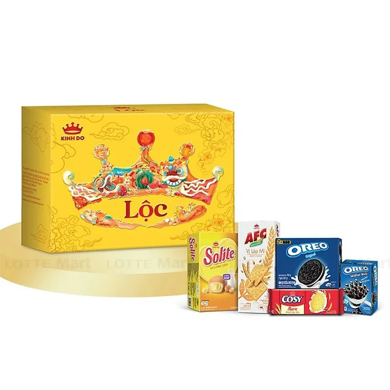 - Hộp Quà Kinh Đô Hamper Vàng không chỉ chất lượng, mà còn tinh tế và giá cả phải chăng. Sản phẩm được đóng gói sang trọng với nhiều sản phẩm cao cấp thích hợp cho bạn lựa chọn làm quà biếu, tặng trong những ngày xuân về hoặc các dịp đặc biệt trong năm. Hộp quà gồm 6 món bao gồm: Bánh bông lan tròn Solite Kem vị bơ sữa, Cosy Marie Bánh Quy Sữa, Bánh Quy Socola Oreo Vị Vani, Bánh Cracker AFC dinh dưỡng vị Cốm Non mỏng giòn, Bánh quế Oreo vị vani, Bánh quy hương vani.