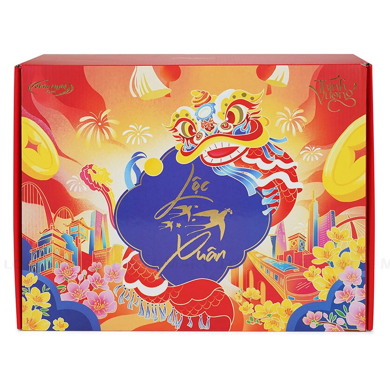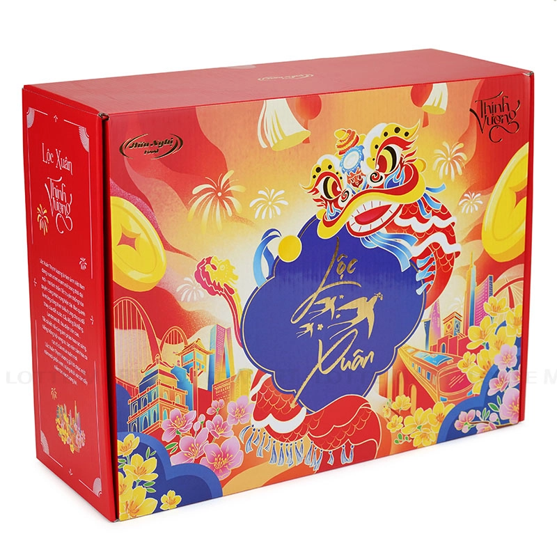 - Hộp quà Lộc Xuân Thịnh Vượng gồm các loại bánh kẹo khác nhau bên trong và túi xách bằng giấy cùng thiết kế bên ngoài.