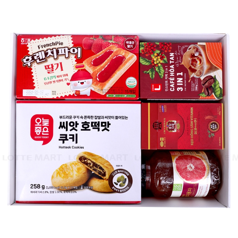 Bộ quà bao gồm 7 món như Bánh Cookie LOTTE Socola Zero Hộp 84G, Bánh Quy Bơ Dừa LOTTE Hộp 300G, Bánh Quế Rondoletti Sô Cô La Hộp 300G, Trà Ssanghwa Hòa Tan Good Today Hộp 30 Gói x 13G, Kẹo Hồng Sâm 365 Không Đường Gói 500G, Bánh Quy Richwell Nhân Kem Dâu Tây Hapie Hộp 104G và Thanh Protein Good Today Hộp 3 Thanh x 50G.