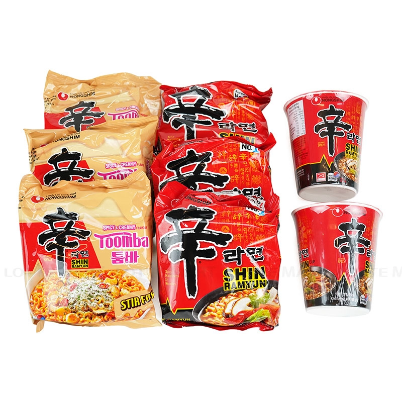 Hộp quà gồm 3 gói Mì Nongshim Shin Ramyun, 2 Ly Mì Nongshim Shin Ramyun tiện lợi và 3 Gói Mì Xào Khô Nongshim Shin Ramyun Toomba mới lạ.