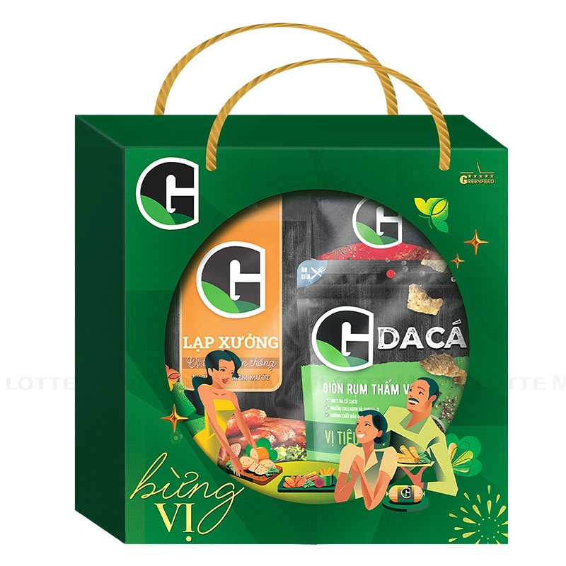- Hộp quà bao gồm các sản phẩm: Da Cá Vị Trứng Muối 25G x 1 Gói, Da Cá Vị Trứng Muối Cay 25G x 1 Gói, Da Cá Vị Tiêu Đen 25G x 1 Gói, Da Heo Vị Tomyum G Kitchen 23G x 1 Gói, Lạp Xưởng Vị Tiêu Truyền Thống G Kitchen 200G x 1 Gói, Thanh Heo Nướng Vị Cay Mala G Kitchen 30G x 2 Gói.