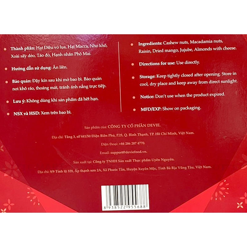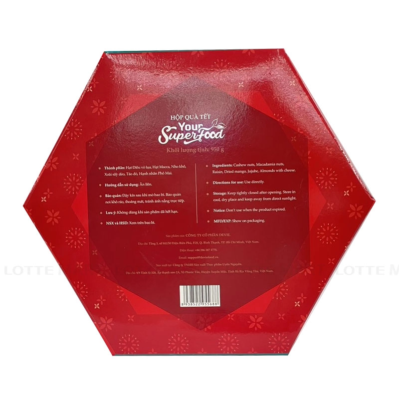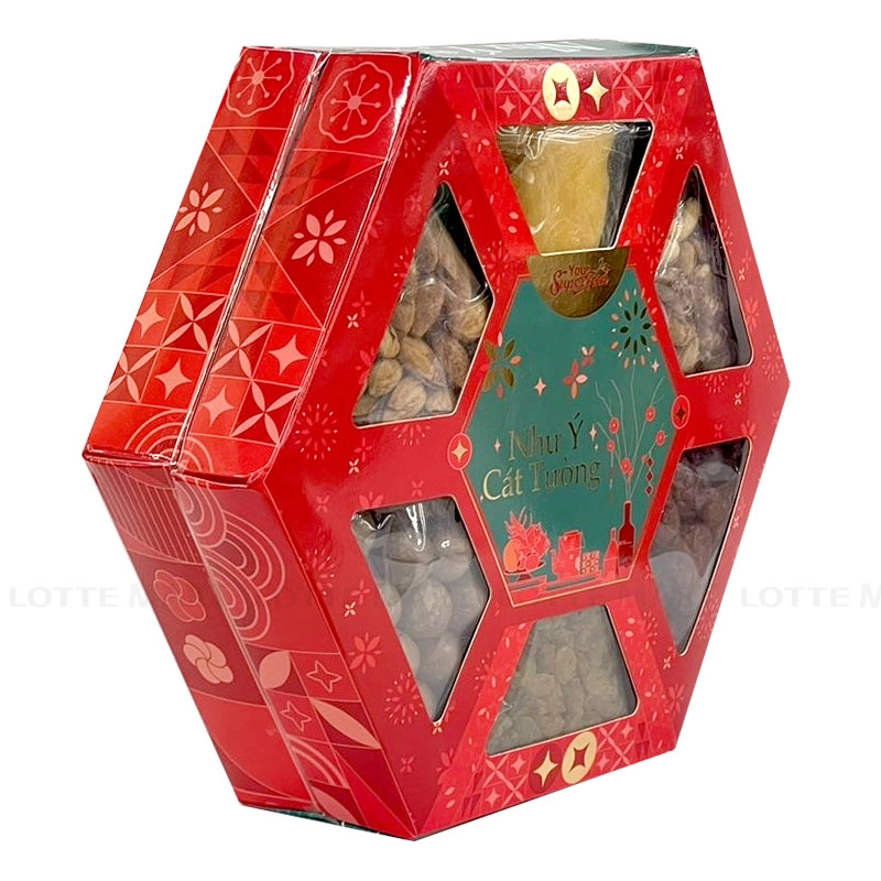Hộp Quà Tết Như Ý Cát Tường Your Superfood là hộp quà bát giác độc đáo với sắc đỏ may mắn, gói trọn 6 thức quà gồm hạt điều vỏ lụa, mắc ca, hạnh nhân phô mai, nho khô, xoài sấy dẻo và táo đỏ cho khay mứt Tết thêm sung túc.